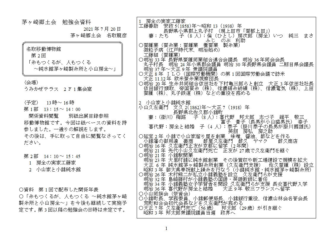 持参の資料を参加者全員で見ながらの説明を第一部とし、第二部は茅ヶ崎純水館のオーナー小山房全(こやまふさもち)の生家 工藤家の話でした。ここで時間がなくなり、養子先の小山家の話は割愛となりました。
